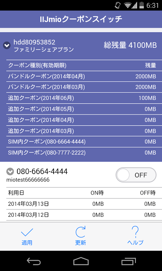 今使っているフリーSIM(ビックSIM=IIJ mio)はクーポンスイッチというアプリを使ってLTEの高速通信モードと低速モードを切り替える事ができます。